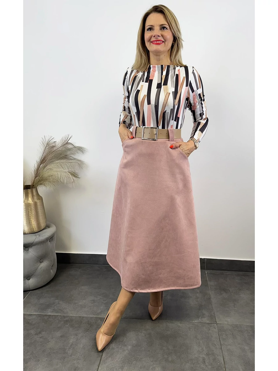 Aura női velúr hatású midi szoknya – ajándék övvelAura midi szoknya tökéletes választás a tavaszi–nyári ruhatár frissítéséhez. A különleges velúr hatású, puha tapintású anyag elegáns megjelenést ad, miközben a gumis derékrész miatt rendkívül kényelmes viselet egész nap. A praktikus zsebeknek köszönhetően nemcsak szép, hanem igazán használható darab is. A nőies midi fazon szépen követi az alakot és minden testalkaton csinosan mutat. A szoknyát a képen látható bézs színű övvel szállítjuk, amely ajándékba jár hozzá, így azonnal komplett szettet kapsz — külön költség nélkül. Elérhető gyönyörű tavaszi árnyalatokban: Miért fogod imádni?