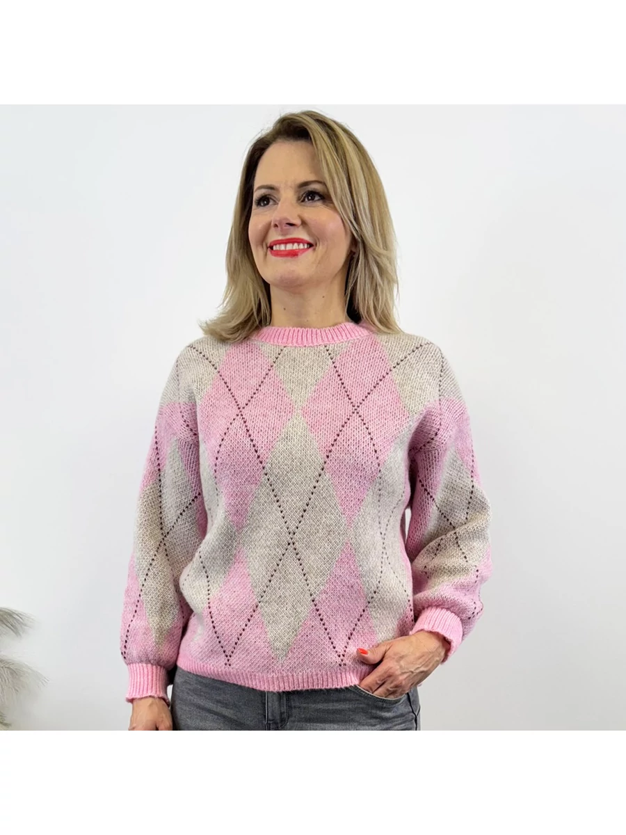 Franciaországból érkezett darab, amelyet könnyű beilleszteni hétköznapi szettekbe. Puha, kellemes tapintású kötött felső finom szürke és púder rózsaszín árnyalatokkal, elegáns rombuszmintával — klasszikus, mégis mai hatás. A visszafogott színekhez jól passzol szürke farmer vagy világos, illetve pasztell színű nadrág, de akár szoknyával is mutatós. Sokáig megőrizze szuper minőségét, kérlek mosásnál vedd figyelembe, hogy gyapjút tartalmaz!