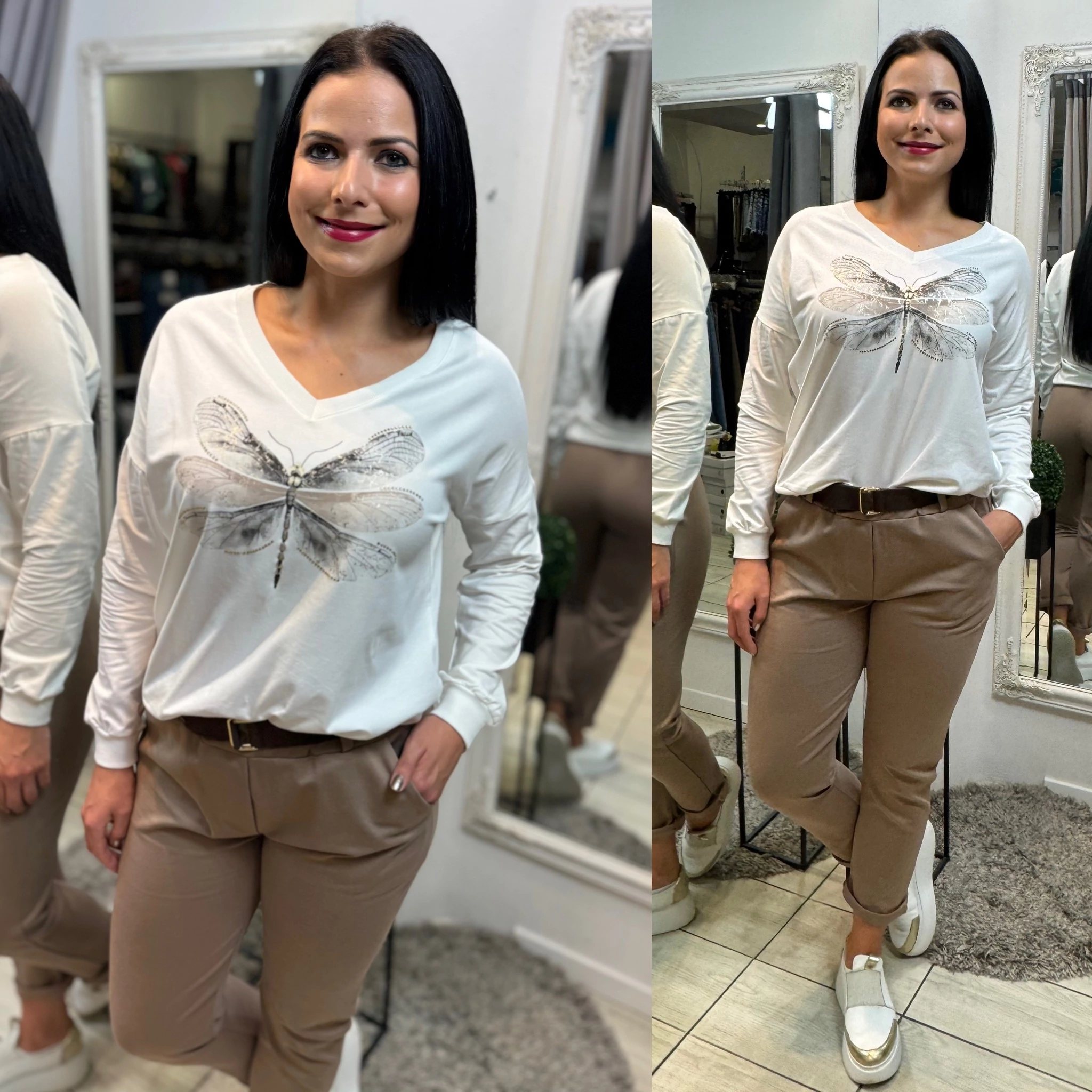 Ez a szitakötős felső egyszerre nőies, különleges és kényelmes. A csillogó minta igazi ékszerként díszíti a hétköznapi szetteket – farmerrel, színes nadrággal vagy akár szoknyával is tökéletes választás. Tedd különlegessé a megjelenésed ezzel a ragyogó darabbal!