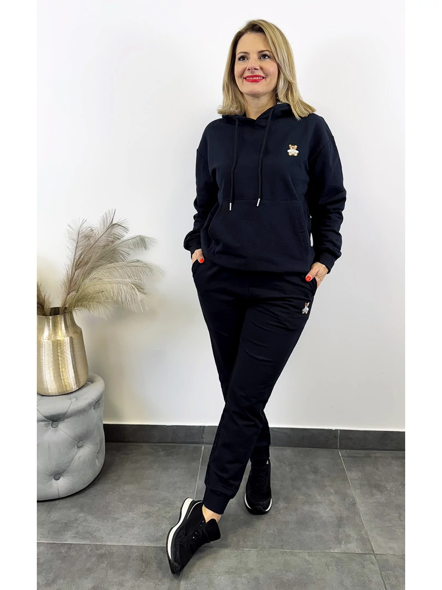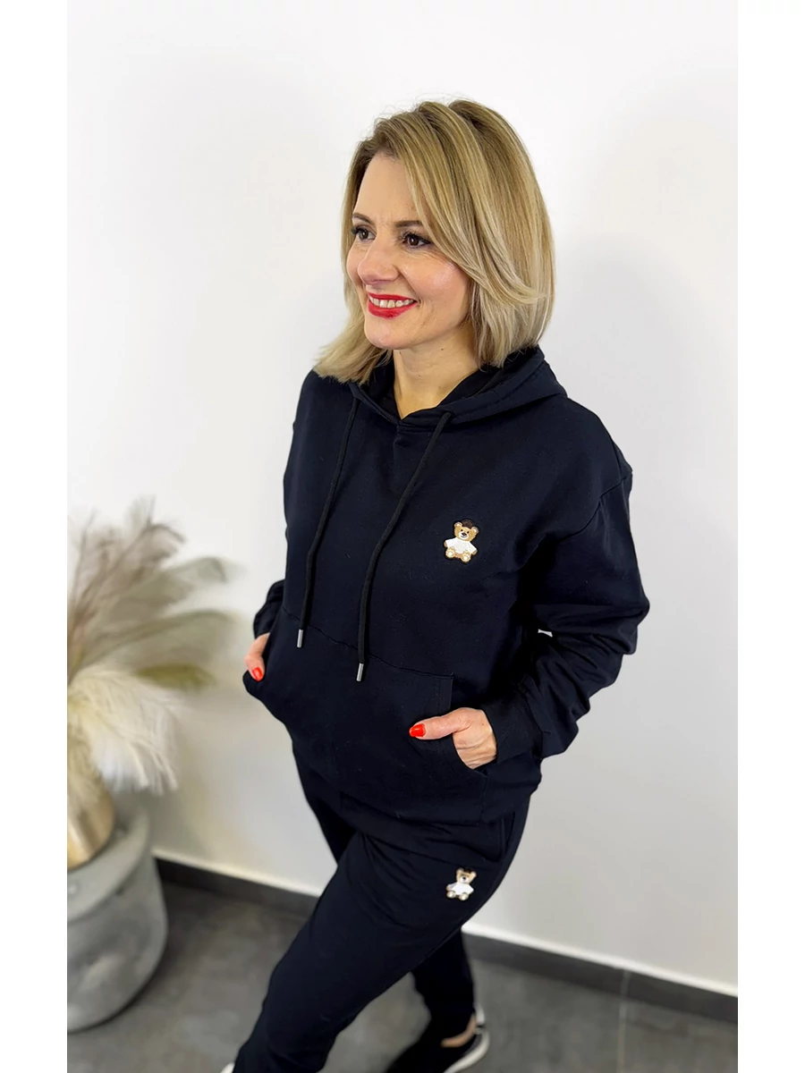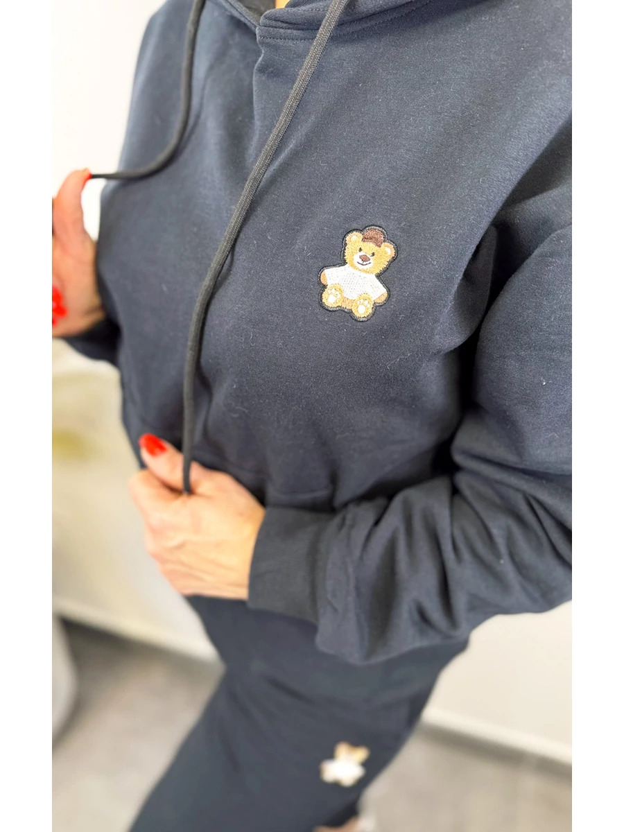 Teddy macis pamut kapucnis melegítőszett ideális választás, ha a kényelem és a stílus egyszerre fontos. A kapucnis felső puha pamut anyagból készült, alja és ujjai passzéval ellátottak, így kellemes viseletet. Cuki macis logó játékos, szerethető megjelenést kölcsönöz.