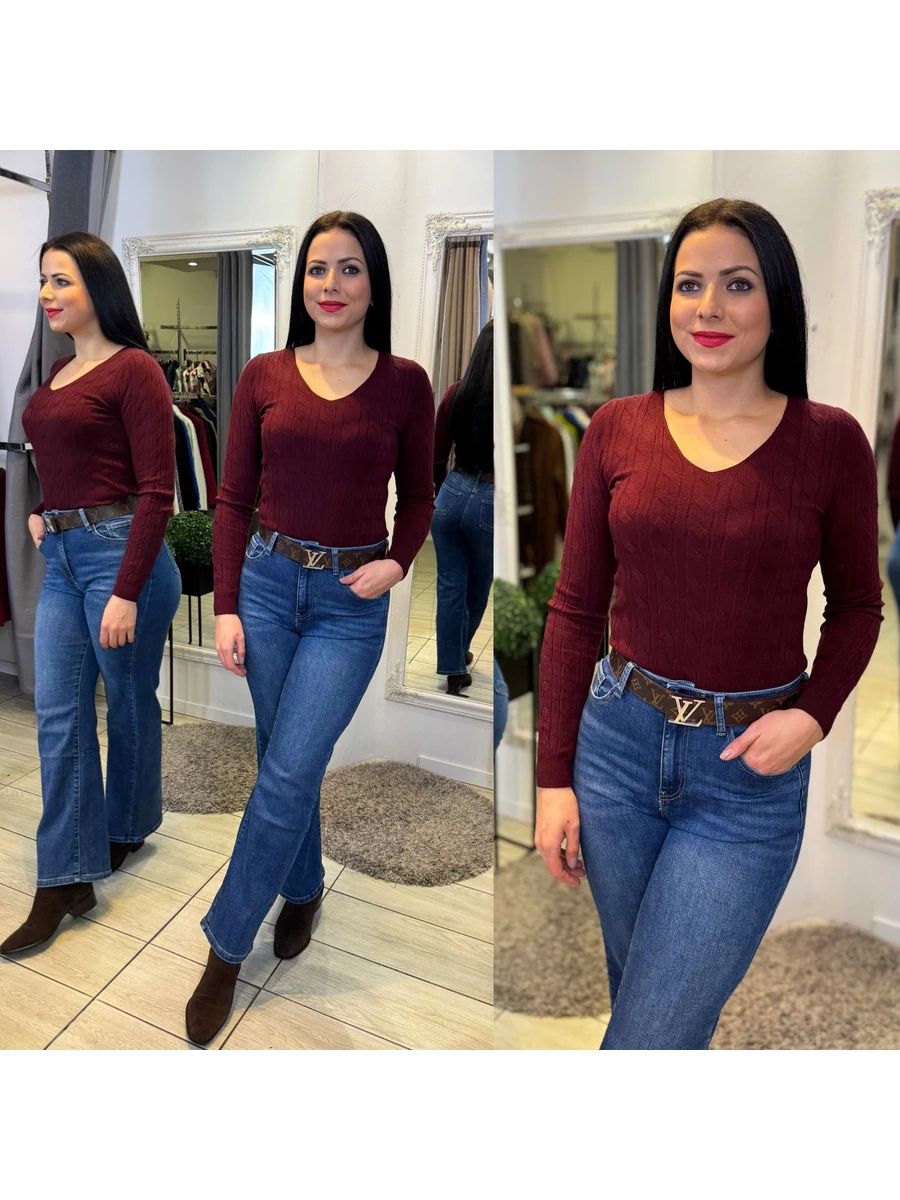 Finom, csavart mintás kötése optikailag karcsúsít, a V-nyak pedig gyönyörűen kiemeli a dekoltázst anélkül, hogy kihívó lenne.