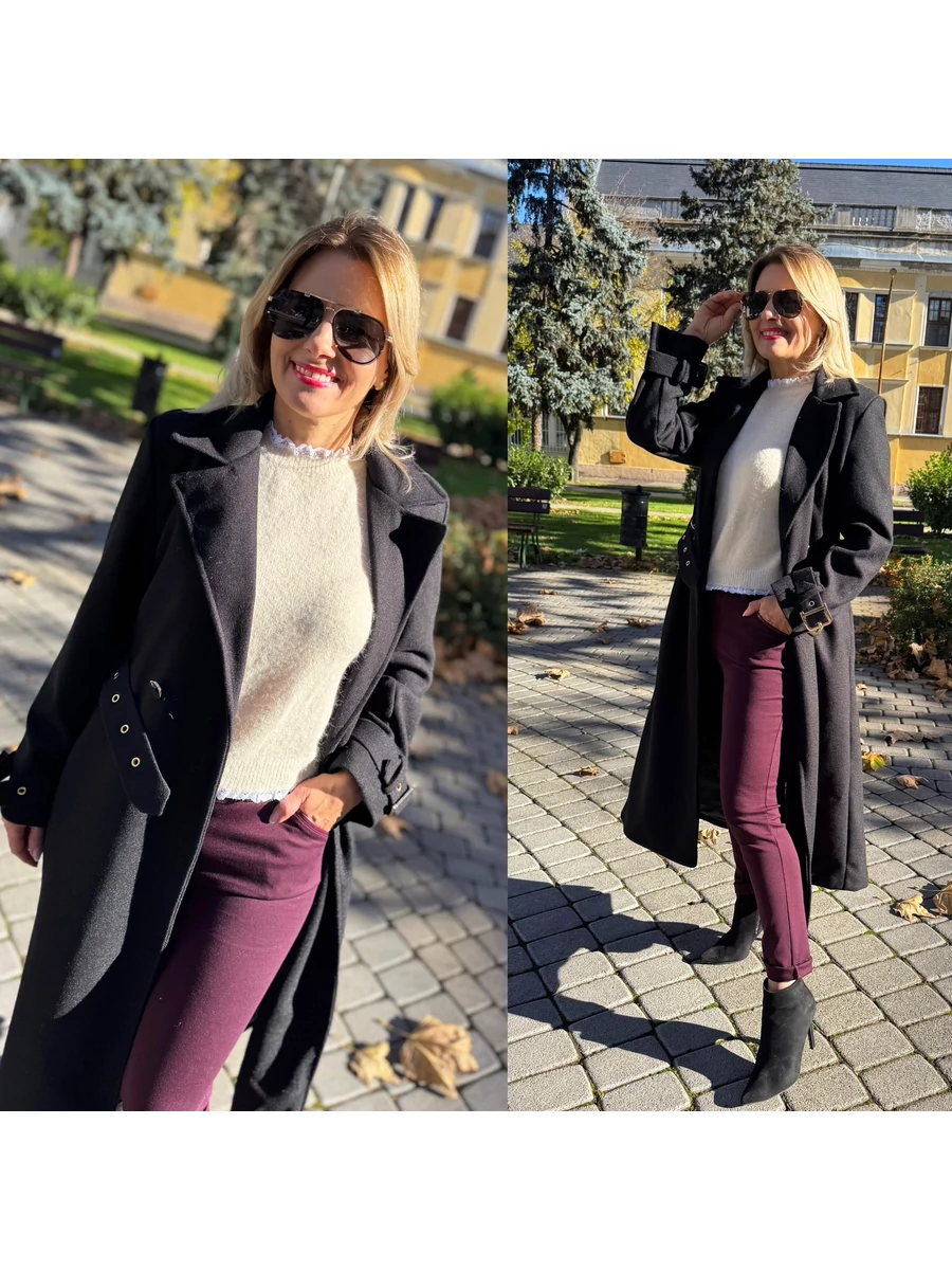 A kabát, ami egyszerre klasszikus és vagány. Pont, mint te! A ROYAL fekete szövetkabát klasszikus szabásával és arany csatos övével kiemeli az alakot, miközben a puha, vastag anyag kényelmet és meleget nyújt a hűvösebb napokon. Elől gombbal és övvel záródik, hátul magasan sliccelt kialakítása nőies mozgást enged. Akár farmerrel, akár elegáns nadrággal viseled, mindig kifinomult hatást kelt. Jellemzők:
